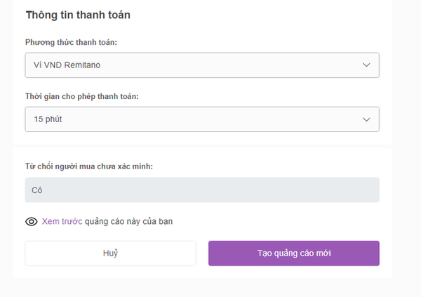 - Thông tin thanh toán: bạn chon một trong các phương thức thanh toán: chuyển khoản ngân hàng, Ví Remitano, Viettel Pay và Momo. Ngoài ra, sàn Remitano đã mặc định Thời gian cho phép thanh toán là 15 phút. Để đảm bảo nguồn tiền sử dụng trên sàn là tiền sạch, sàn Remitano chỉ cho phép các tài khoản xác minh danh tính mới được giao dịch. Vì vậy, bạn hoàn toàn yên tâm khi mua/bán trên sàn nhé.